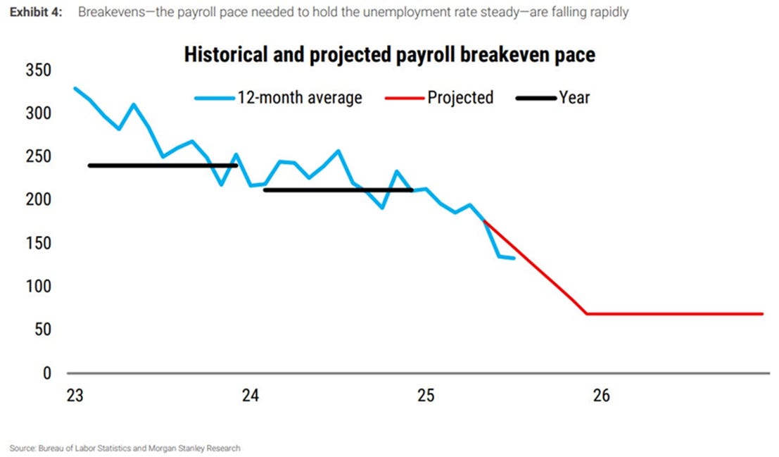 最大的不确定性是就业数据。下图是维持失业率不变所需的就业人数,2025年开启的下降主要是特朗普上台后的移民政策的结果(分母和分子同时放慢增长速度)。