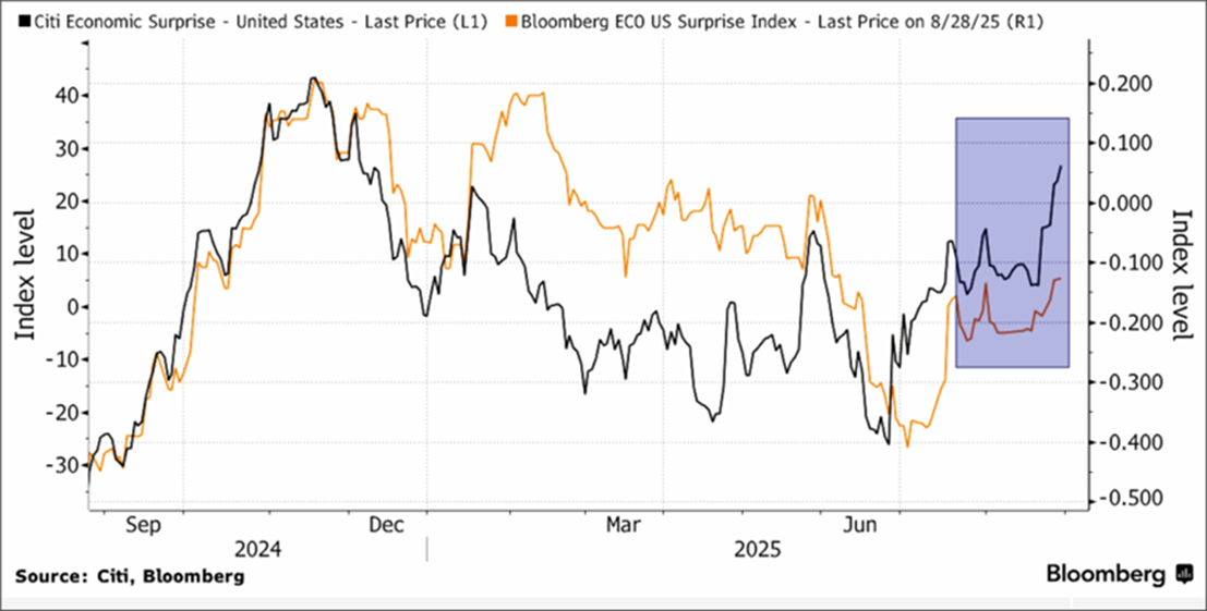 不过,今年的市场在以自己的节奏进行着。例如,由于四月的恐慌,降低了第二季度企业财报的利润门槛,因此刚过的财报季整体依然是超预期的。从宏观经济来看,最近的GDP增长修正显示为上调,花旗银行的经济意外指数也从横盘开始反弹(加下图)。