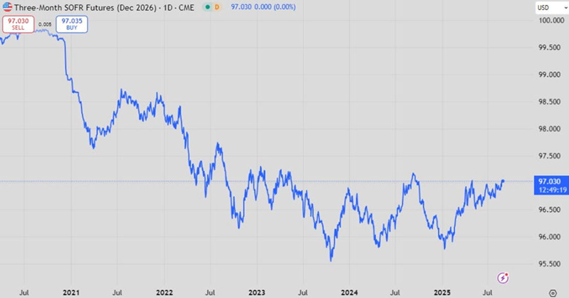 这几个交易日,债券市场对鲍威尔在杰克逊霍尔的转向表现变得正常了:所谓正常,是指鲍威尔指向一,市场跑出去三或四。从最近的SOFR期货来看,到2026年底前将有六次全面降息(下图是2026年12月的SOFR合约,97的数值相当于3%的利率)。