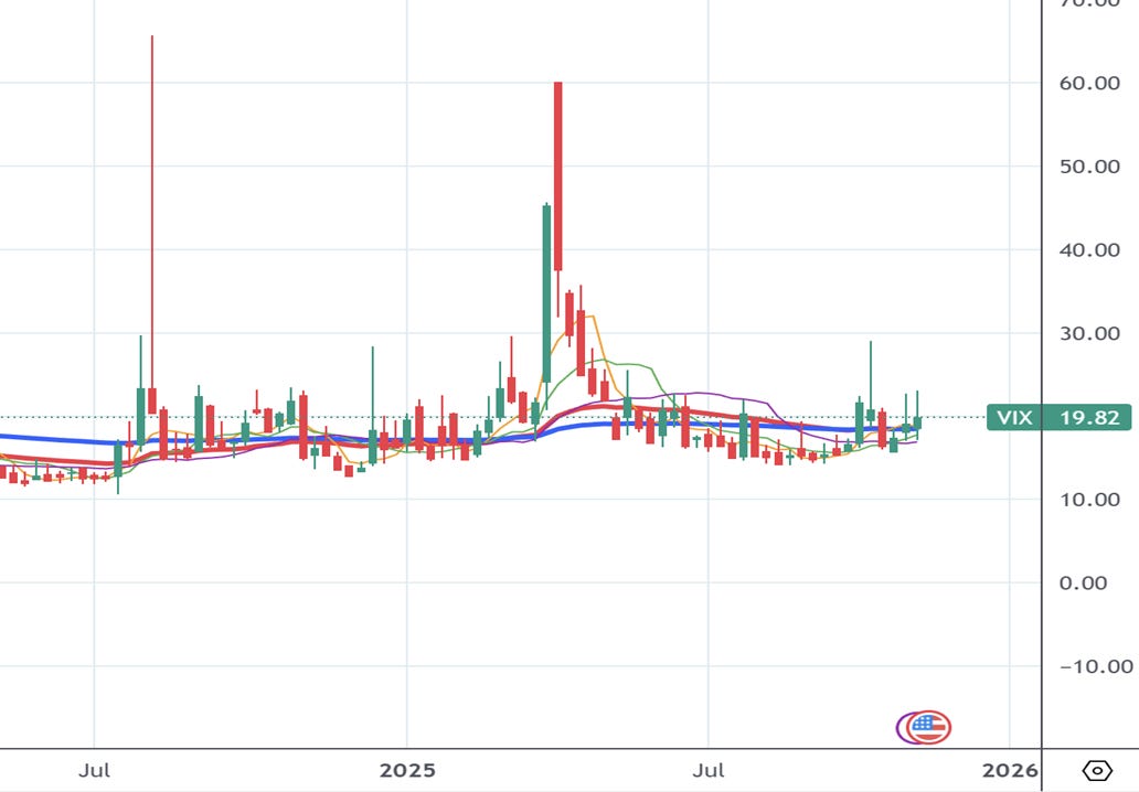 不过,全球风险资产从10月29日开始是处在risk-off压力山大:避险交易回归,VIX目前冲高回落,落在了低于20的19.82(见下图)。从VIX来看,市场仍然处在受惊状态,所以投资人仍然很警觉。